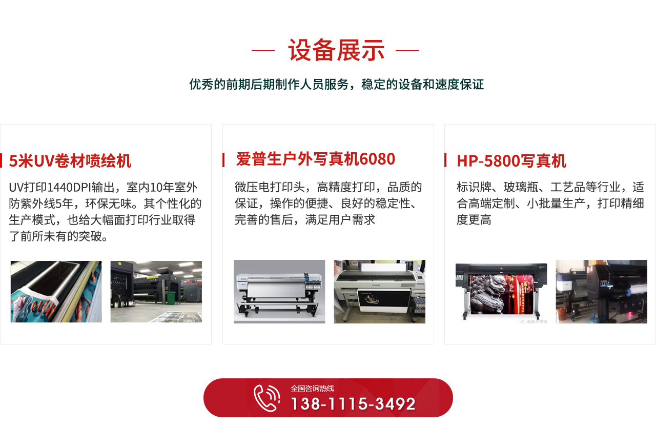 多臺5M3.2MUV打印設(shè)備,多臺愛普生HP打印設(shè)備,進口后道設(shè)備,全套多臺快速加工能力大廠房為批量加工奠定基礎(chǔ)能力的能力,快效的項目執(zhí)行能力、優(yōu)異的團隊協(xié)作能力
